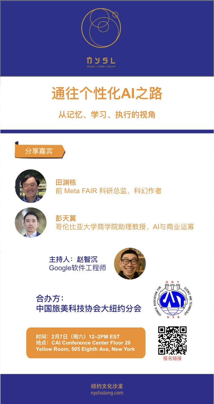 本期沙龙,我们联手中国旅美科技协会大纽约分会,特邀田渊栋博士与彭天翼教授,与大家共同探讨这些前瞻且关键的问题。